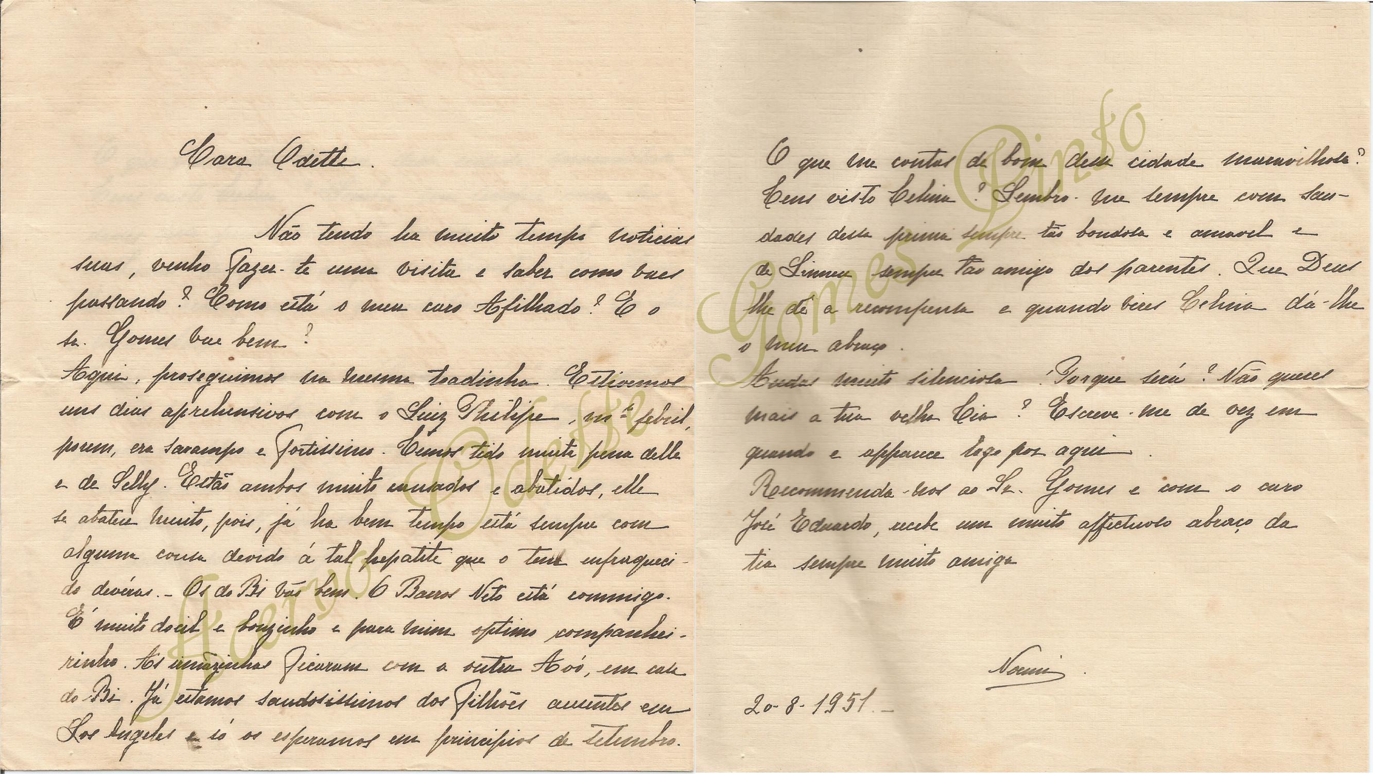 Carta de tia Noemi para sua sobrinha Odette em 20 de agosto de 1951
