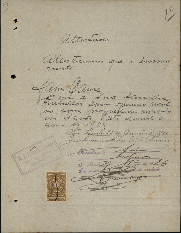 com a sua família trabalhou como operário rural na nossa propriedade agrícola em Capão Preto durante o ano de 1923.