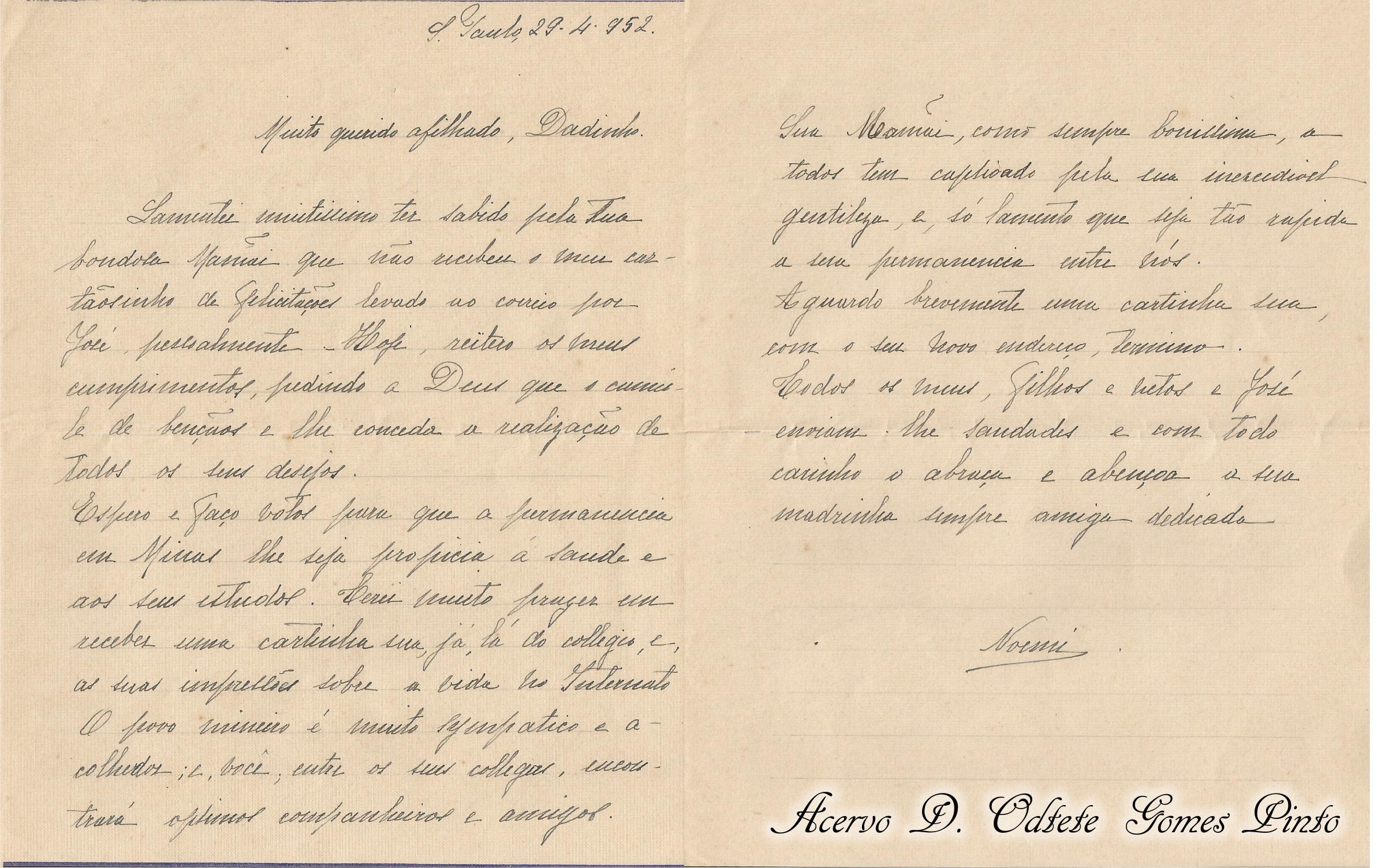Carta da Tia Noemi para o sobrinho e afilhado Dadinho em 1952